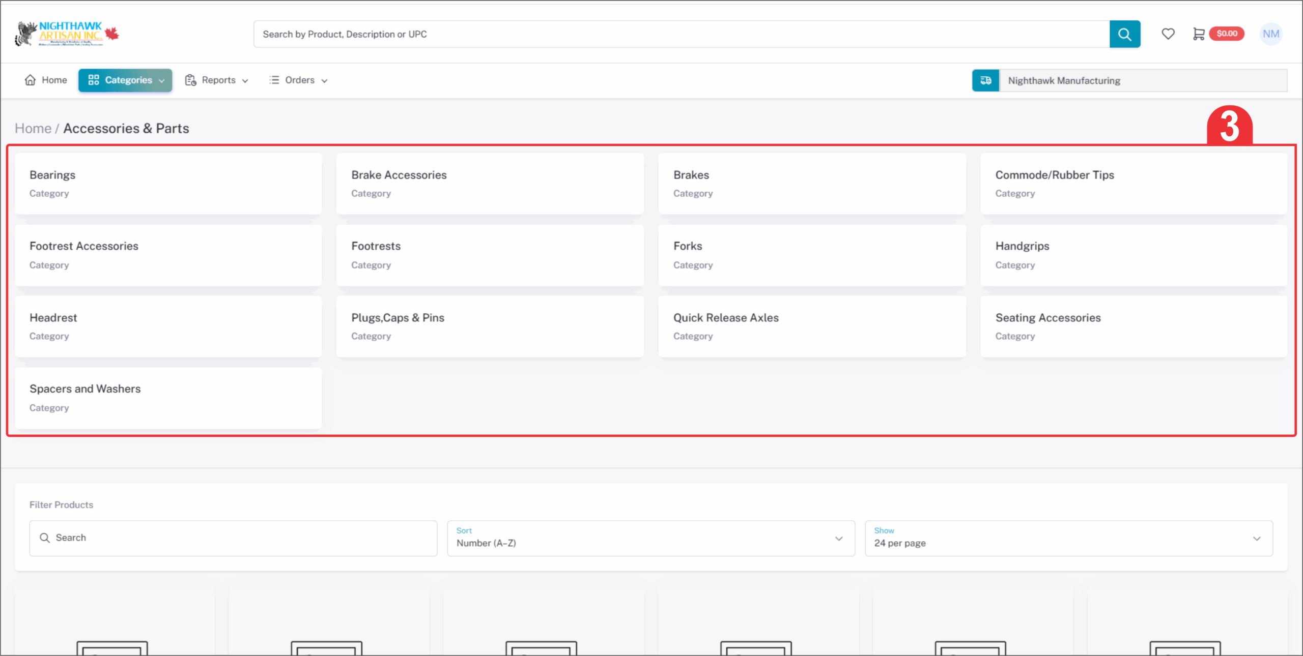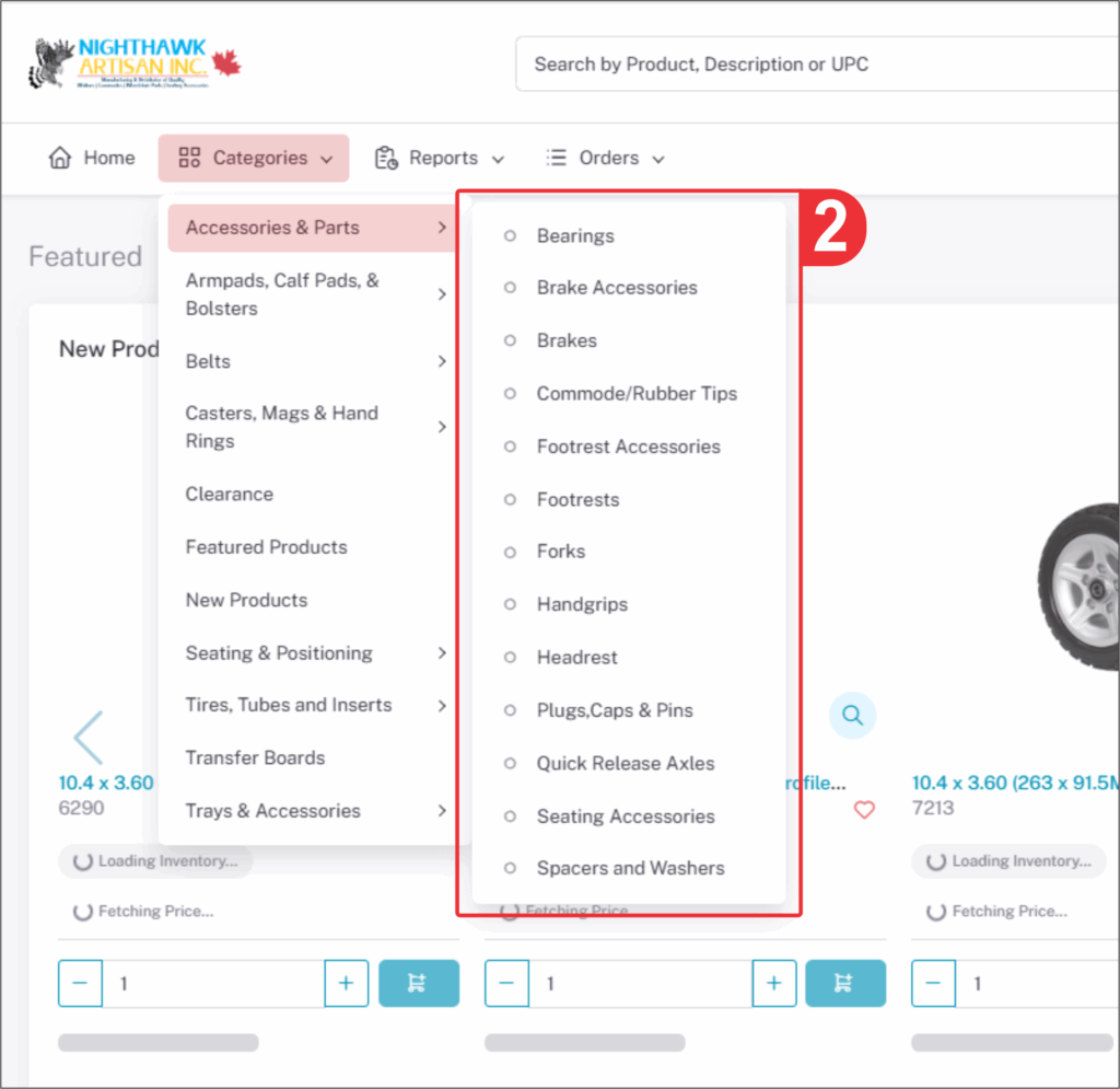 You may click the sub-category² to get the product under that category. You can select a product in two ways. The first way is to just change quantiy and click“ADD TO CART” it will be added to shopping cart in the top right of the page when done you can checkout.